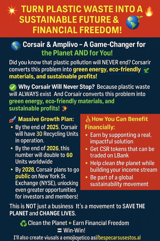 🔥💥 #Corsair #Amplivo #PlasticRecycling #Microplastics #Health #GreenEnergy #CSRtokens #FinancialFreedom #CleanPlanet #GreenFuture #CircularEconomy #InvestInThePlanet #EcoBusiness 💥🔥