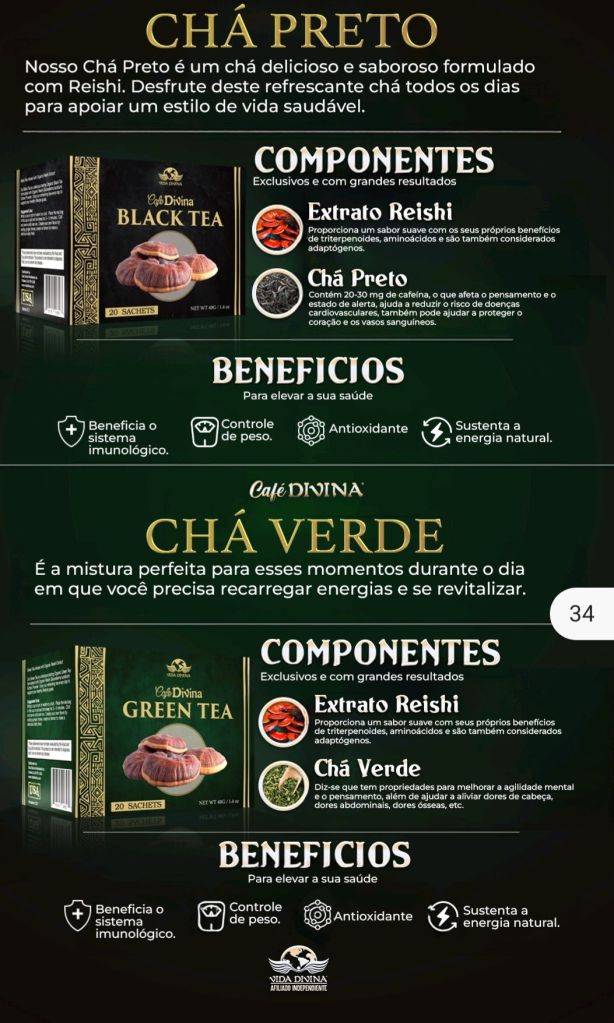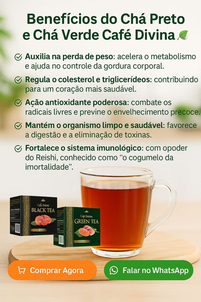 👉 Você sabia que uma simples escolha diária pode transformar a sua saúde no futuro? O Chá Preto e o Chá Verde Café Divina, formulados com extrato de Reishi, são muito mais do que uma bebida: são aliados naturais para manter o corpo em equilíbrio e a mente renovada.