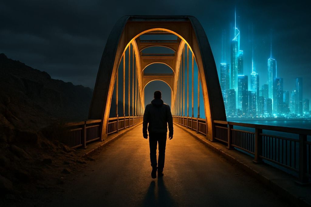 A powerful contrast: on one side an old dusty road with a person walking 🏞️, on the other side a bright modern city skyline 🌆 — symbolizing *transition from old paradigms to new realities*.