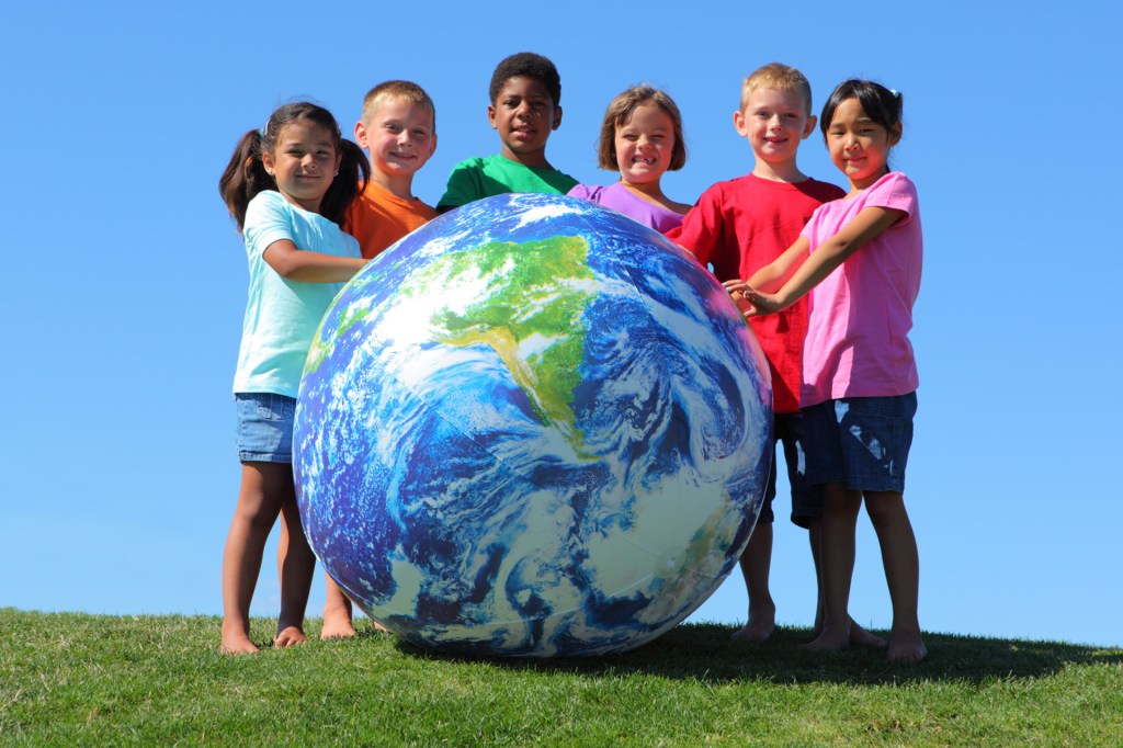 Group of multiethnic children holding model of earth in park with copy space. Primary students holding a big handmade earth model and raising it high. Hands of school children holding green world for save the planet, earth day, global peace and unity concept.