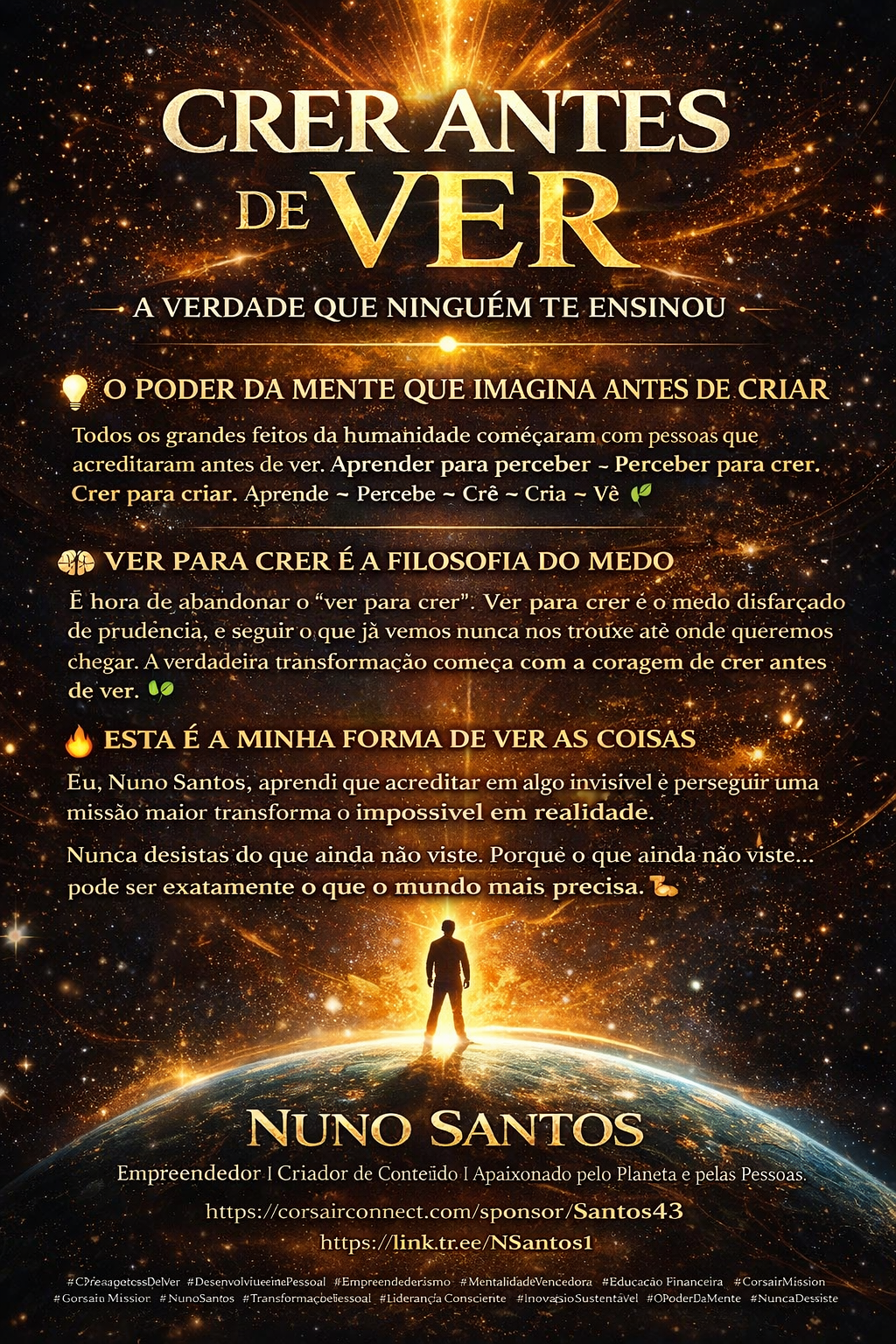 #CreerAntesDeVer #DesenvolvimentoPessoal #Empreendedorismo #MentalidadeVencedora #EducaçãoFinanceira #CorsairMission #Sustentabilidade #NunoSantos #TransformaçãoPessoal #LiderançaConsciente #InovaçãoSustentável #OPoderDaMente #NunDesistas #CriarAntesDeVer #PlanetaTerra